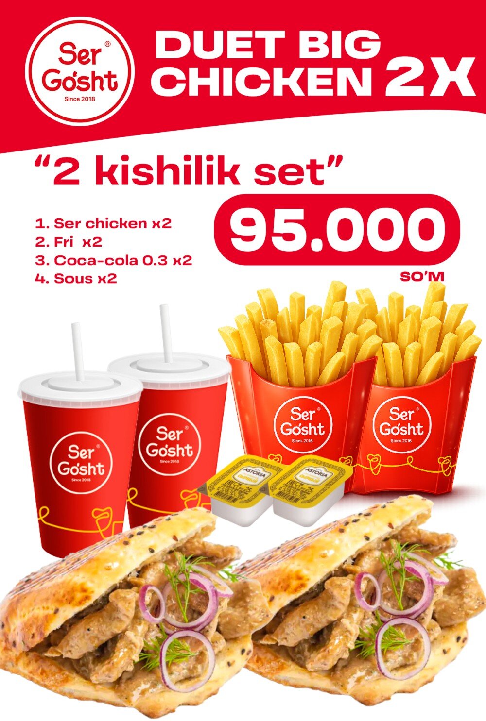 Serchicken big 2 ta + kartoshka fri 2 ta 100 gr. + cola razliv 2 ta 200 ml.