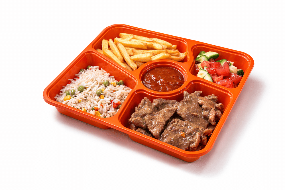 Dimlangan go'sht, mayin ta'mga ega guruch, kartoshka fri hamda salatdan iborat ajoyib uyg'unlik.